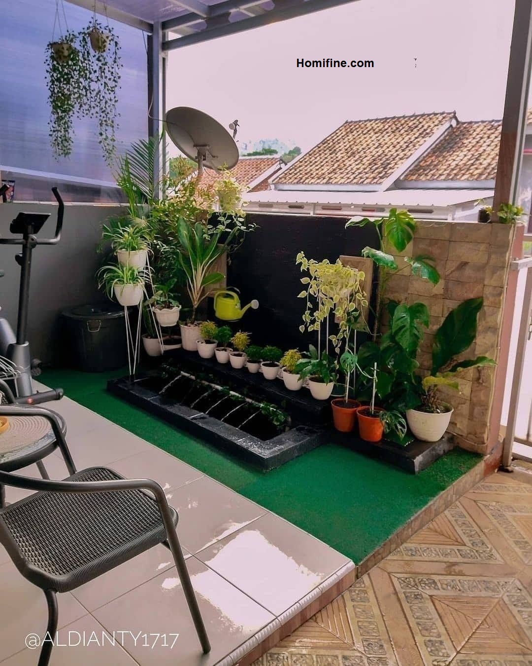 With a small size, this terrace looks cool by utilizing its area as a garden, which is displayed in pots of various sizes. In addition, this terrace garden, is also equipped with a fishpond, which has a more natural feel and is the best idea to make the small terrace look more alive.