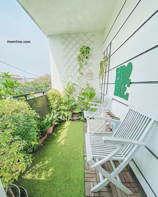 This first balcony design has a fresh look with the dominance of green plants it has. Not only that, the floor is equipped with synthetic grass, which is used as a comfortable carpet when relaxing. To give a neat impression and can accommodate more plants, additional shelves will be the right choice to complement your balcony.