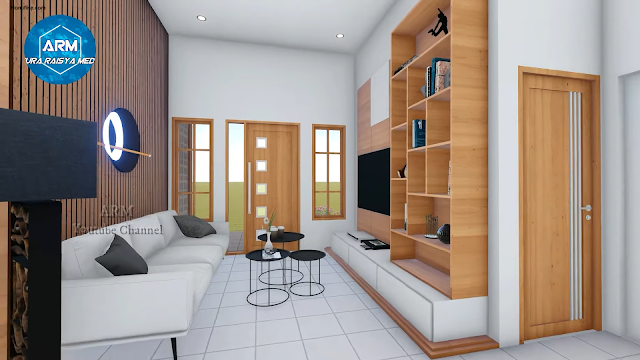 For the interior area, the living room is at the very front with a clever arrangement of furniture. The sofa is arranged linearly facing the television cabinet. The wall area is made functional by adding storage displays that can organize some decorations in a more space-saving and stunning way.
